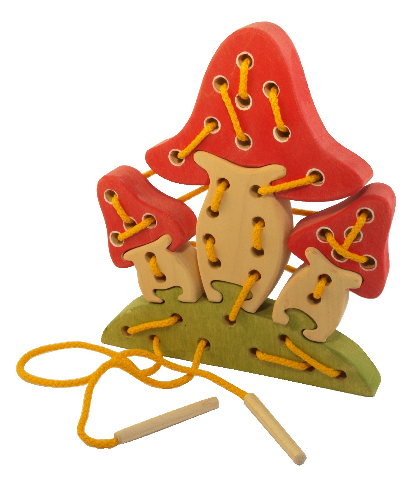 <<Мухоморы>> - игра занимательная по своей композиции и идее. Эта шнуровка-пазл увлечет своим процессом сборки и <<шитья>> деток разного возраста. Деткам от года будет интересно продевать деревянную иголочку в дырочку и вытягивать шнурочек. Пусть поначалу это будет всего две-три дырочки с помощью мамы, но постепенно это занятие разовьет в малыше ловкость пальчиков и он приноровится делать все самостоятельно. А детки постарше и пазл из шляпок, ножек и полянки соберут и украсят симпатичные мухоморчики затейливой шнуровкой.